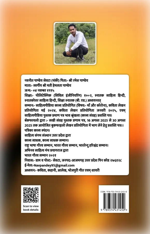 Irshad Aatif 1 book · 5,403 words RUBROO : HINDI KAVITA SANGRAH / रूबरू : हिन्दी कविता संग्रह इरशाद आतिफ़ Vandana Sood 2 books · 8,364 words Bhavnaon Ki Dhoop : Sabki Kahani Alag Hokar Bhi Ek Hai / भावनाओं की धूप : सबकी कहानी अलग होकर भी एक है वन्दना सूद यह कविता संग्रह भावनाओं की ऐसी धूप है, जो हमारे जीवन के कितने ही रंगों से हमारी मुलाकात कराती है। यह किताब हमारी खामोशियों की वह आवाज़ है, जिसकी गूँज निरन्तर हमारे भीतर गूँजती रहती है। इसका हर पन्ना,मानो आपकी... amaradwiteey 2 books · 22,384 words CHUNKI MAIN HANSTA RAHA HOON : GHAZAL SANGRAH / चूँकि मैं हँसता रहा हूँ : गजल संग्रह अमर अद्वितीय 'बिसावर' RAJ KUMAR JHA 1 book · 3,484 words Deewaron Ke Shehar Mein : Kavita Sangrah / दीवारों के शहर में : कविता संग्रह राज कुमार झा इस कविता संग्रह में मैंने जीवन के प्रत्येक क्षण को कविता के माध्यम से अभिव्यक्त करने का प्रयास किया है। "चलते चले जा मुसाफिर कि मंज़िल को तेरा इन्तिज़ार बेकरारी से है।" राज कुमार झा anjneetnijjar222 1 book · 10,954 words Ahsaas : Dil Ki Bhavnaye / अहसास : दिल की भावनाएँ अंजनीत निज्जर seema sharma 1 book · 6,206 words Arz Kiya Hai / अर्ज़ किया है... सीमा शर्मा 'विजया' Akhilesh Singh 1 book · 3,588 words Parchhai : Kavya Sangrah / परछाई : काव्य संग्रह अखिलेश सिंह Padmakshi Shukla 1 book · 13,460 words Nikunj Ras Madhurya : Gitika Sangrah / निकुंज रस माधुर्य : गीतिका संग्रह पद्माक्षि शुक्ल अक्षि देवेंद्र प्रताप वर्मा 'विनीत' 4 books · 36,349 words CHANDOVA / चंदोवा देवेंद्र प्रताप वर्मा 'विनीत' Er.Navaneet R Shandily 6 books · 97,730 words Yatharth Se Door : Seota Ki Gatha / यथार्थ से दूर : सेवटा की गाथा नवनीत पाण्डेय चंकी “यथार्थ से दूर : सेवटा की गाथा” ग्राम सेवटा के माध्यम से पूरे भारतीय ग्राम जीवन की आत्मा को स्वर देती है। यह केवल एक गाँव की कथा नहीं, बल्कि संस्कार, स्मृति, संस्कृति और सत्य की वह यात्रा है जहाँ... Ankita Publishing studio 1 book · 3,236 words Kavya Ki Sugandh / काव्य की सुगंध अंकिता सिंह DR KAVI KUMAR NIRMAL 1 book · 9,898 words Bhaav Pallawan : Kavya Sankalan / भाव पल्लवन : काव्य संकलन डॉ. कवि कुमार निर्मल Neeraj Kumar Agarwal 1 book · 10,754 words Aap Aur Hum Adhunik Sach : Rangmanch Per Aap Aur Hum / आप और हम आधुनिक सच : रंगमंच पर आप और हम नीरज कुमार अग्रवाल Pushpa Nirmal 1 book · 7,315 words Pushpa Kavyangan : Kavya Sankalan / पुष्पा काव्यांगन : काव्य संकलन पुष्पा निर्मल Er.Navaneet R Shandily 6 books · 97,730 words Sakhyanjali / सख्याञ्जलि नवनीत पाण्डेय चंकी “सख्याञ्जलि” जीवन की उन सच्ची भावनाओं का एक गद्य-संग्रह है, जो मित्रता, प्रेम और स्मृतियों की ऊष्मा से जन्म लेती हैं। यह पुस्तक हृदय से निकली उन पँक्तियों का संकलन है, जो कभी बिछुड़े साथियों के लिए श्रद्धांजलि हैं, तो... Santosh kumar Miri 3 books · 21,190 words Roshni Ki Barish : Ekal Kavya Sankalan / रोशनी की बारिश : एकल काव्य संकलन कविगुरु डॉ.संतोष कुमार मिरी हरवंश हृदय 1 book · 3,829 words HRIDAY SE HRIDAY TAK / हृदय से हृदय तक हरवंश हृदय abbynagra27 1 book · 7,172 words Digital Detox: Bloom Beyond The Noise : How To Heal From Notification Overload, Reclaim Your Focus Abby Nagra chamanpgteng 2 books · 30,086 words Live In High Consciousness : Finding Happiness, Inspiration, And Success CHAMAN LAL Kapil Gurjar 1 book · 3,271 words Mujhe Tumse Bahut Kuch Kehna Hai / मुझे तुमसे बहुत कुछ कहना है कपिल कुमार 'गुर्जर' Shubham Anand Manmeet 1 book · 3,440 words Manmeet Mere / मनमीत मेरे शुभम आनंद मनमीत Avinash Dehariya 1 book · 4,233 words Shabd - Srijan Yatra : Har Ehsaas Ki Ek Rachna / शब्द-