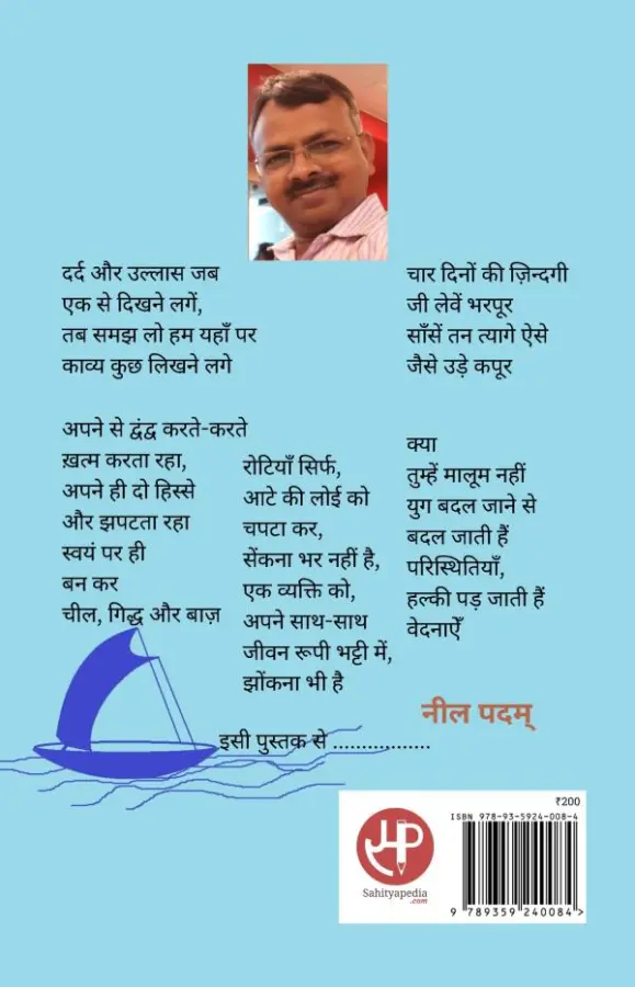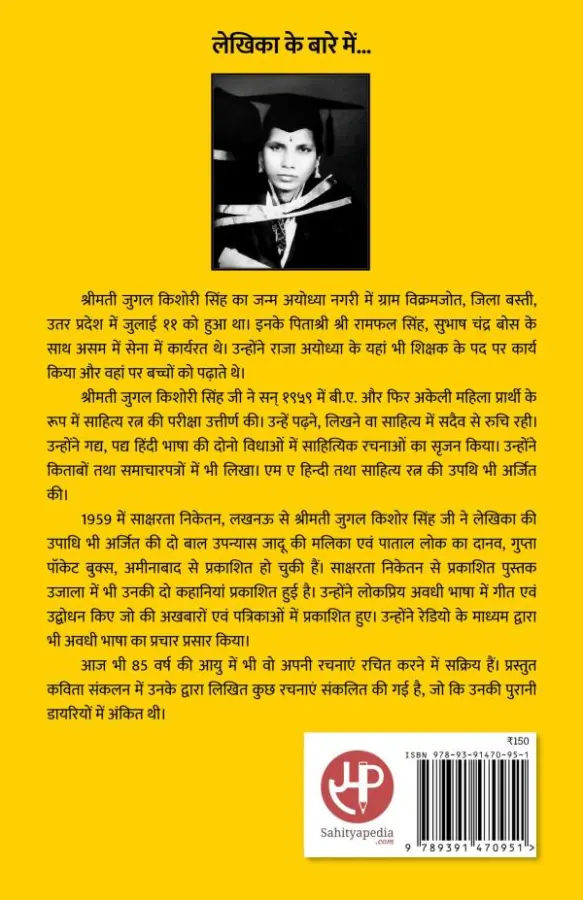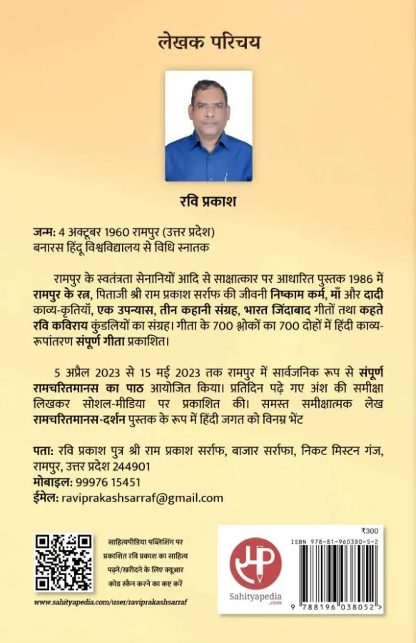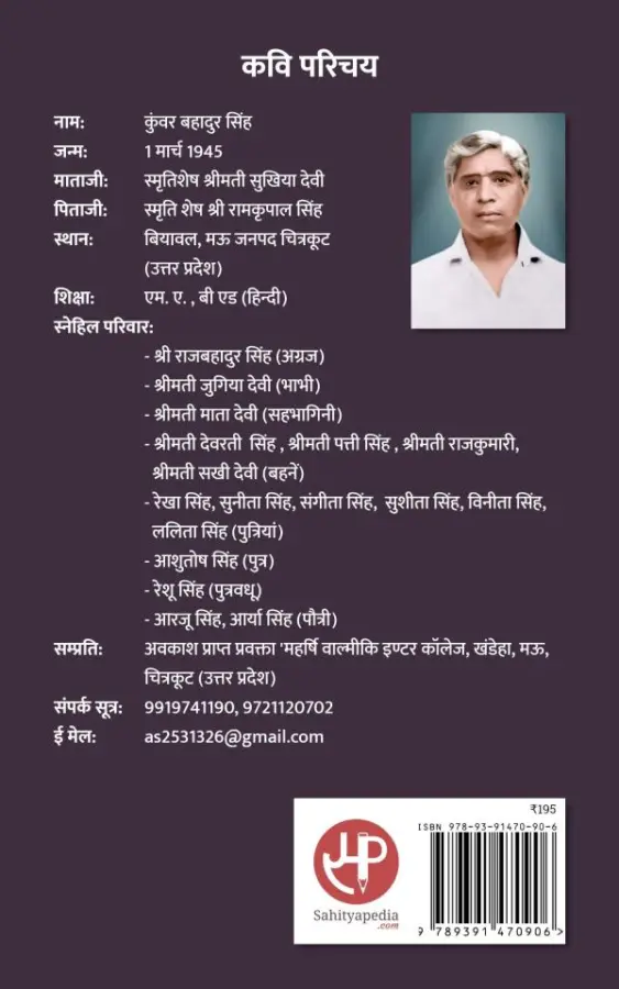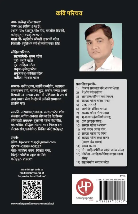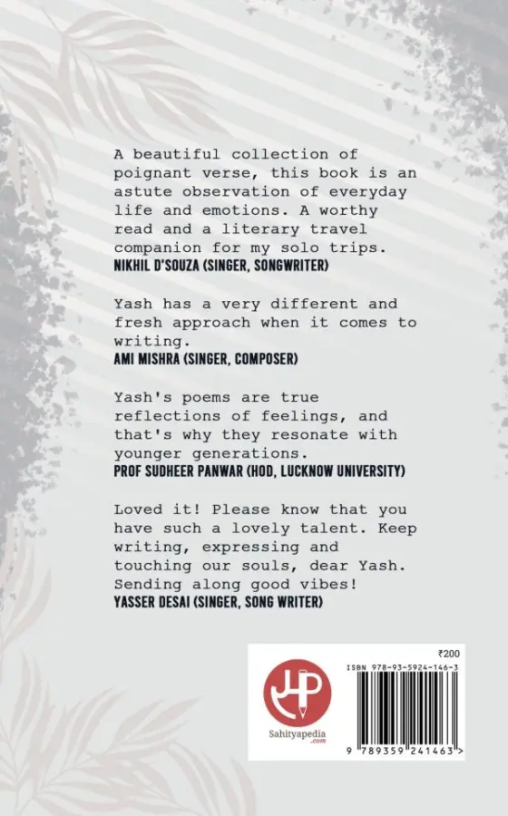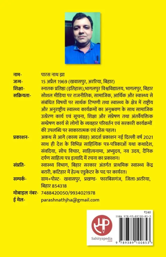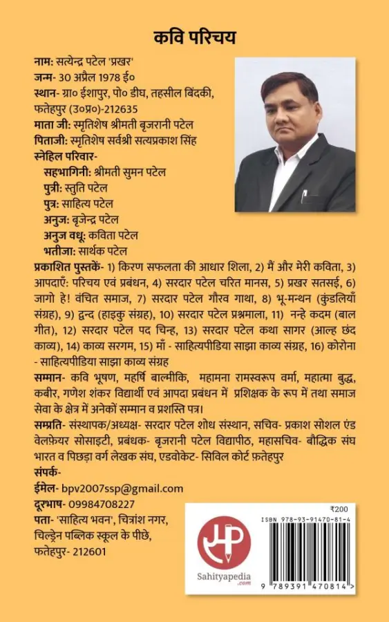 डॉ. श्री रमण 1 book · 3,564 words Solah Shringar Sri Raman 'Shripad' नवविवाहित यौवनाएंँ जब सोलह शृंगार में सजकर प्रीतम के सम्मुख आतीं हैं तब अपने रूप- लावण्य से उन्हें मंत्रमुग्ध कर लेती हैं वैसे ही काव्य संग्रह 'सोलह शृंगार' की कविताएंँ विभिन्न भावों, विचारों यथा ईश-वंदना, प्रकृति-प्रेम, जीवन-दर्शन, हास्य-व्यंग से पूर्ण... Dr. Dushyant Kumar 3 books · 18,216 words Hum Par Atyachar Kyon Dushyant Kumar "हम पर अत्याचार क्यों? " पुस्तक यथार्थवाद पर आधारित है। इस पुस्तक में सत्य, लोगों की पीड़ा, दुख-दर्द, युद्ध से विनाश आदि के वर्णन के साथ-साथ अंधविश्वास, शोषण छुआछूत-भेदभाव व अमानवीय कृत्यों पर प्रहार किया गया हैं। यह जातिवाद, धर्मवाद,... Dr. Sukriti Ghosh 2 books · 16,051 words Shabd Shabd Geet Hai Dr. Sukriti Ghosh "शब्द शब्द गीत है" मनमोहक और रोचक कविताओं का एक लघु काव्य संग्रह है। जीवन के सतरंगी रंगों से रंगी हुई, डाॅ. सुकृति घोष की ये कविताएँ प्रीत की भीनी खुशबू से सुवासित हैं। कलात्मक, अलंकृत और सुरुचिपूर्ण भाषा शैली... Ahtesham Ahmad 4 books · 21,838 words Bheege Jazbaat (Ek Kavya Sangrah) Md Ahtesham Ahmad इंसान का दिल एक नाज़ुक फूल की तरह होता है। जब ये जज़्बात की तेज़ मूसलाधार बारिश की चपेट में आ कर भीग जाता है तब इसकी नाज़ुक पंखुड़ियाँ ज़ख्मी हो जाती हैं और फूलरूपी दिल भीग कर नम पड़... Satish Srijan 1 book · 6,394 words Kshitij Ke Us Paar Kya Hai Satish Srijan 'सतीश सृजन' साहित्यप्रेमी,साहित्य का विद्यार्थी है,छोटे छोटे प्रयास करता रहता है। उसी क्रम में "क्षितिज के उस पार क्या है"विविध सन्दर्भों पर आधारित कुछ मनभावनी रचनाओं का काव्य संग्रह पाठकों के समक्ष प्रस्तुत है। पुस्तक में जन सामान्य सुलभ प्रवाहमयी... Awadhesh Kumar Singh 1 book · 5,297 words Meghanchal Awadhesh Kumar "मेघांचल" काव्य संकलन श्री अवधेश कुमार जी की साहित्यिक यात्रा की प्रथम सतरंगी अभिव्यक्ति है। इसमें हिंदी, भोजपुरी और अंग्रेजी भाषा में बहुत ही सरल और सहज रूप से प्रेम, भक्ति, जिजीविषा, बचपन, पीड़ा, संवेदना, और आध्यात्म के प्रति उपजे... सुरेश कुमार चतुर्वेदी 4 books · 31,829 words Ek Pate Ki Baat Suresh Kumar Chaturvedi धर्म एवं स्व धर्म से परिचित करातीं, स्वयं से संवाद करतीं रोचक एवं सार्थक रचनाएं अंतस को छू जातीं हैं। धर्म के मूल तत्वों के परिचय के साथ, धर्म के नाम पर मानवीय विद्रूपताओं को उजागर करतीं हैं। राजनीति में... Rajeev Shukla 1 book · 53,608 words Acoustic Analysis of Syllables of Tabla Dr. Rajeev Shukla Musical sound contains multiple frequencies in harmonic and inharmonic ratios. Verification of Raman's model, effect of different parts of tabla on its tonal qualities and effect of sound and rhythm of tabla on human nature and behaviour have been studied... Yashvardhan Goel 1 book · 7,658 words Kuch Khwab Bhej Dun Yashvardhan Goel आसान से शब्दों में गहरायी को निकाल कर रख देना हर पंक्ति अपने आप में बस यही बताती है “कुछ ख़्वाब भेज दूँ “ यशवर्धन गोयल का पहला काव्य संग्रह है जो ख़यालों को हक़ीक़त से कितना रिश्ता रखने की... Prakash Chandra 1 book · 5,845 words Teri Dhadkan Mere Geet Prakash Chandra Rastogi प्रस्तुत काव्यांजलि में समाज के विभिन्न वर्गों के दिलों की धड़कन और देशभक्ति की बगिया के विविध प्रकार के फूलों की सुग